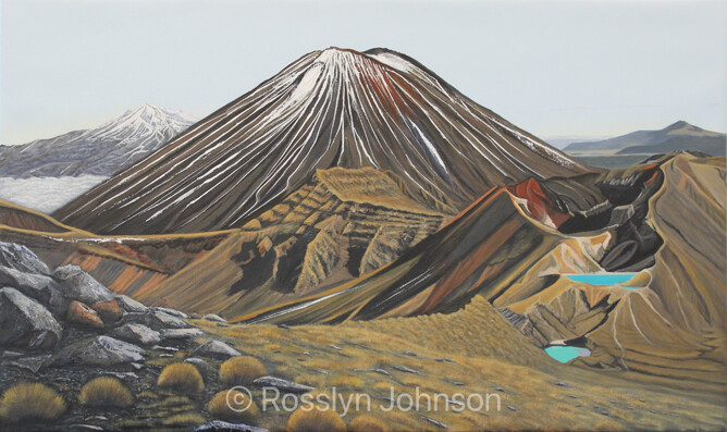 This painting is the last of 4 that I have painted for a client in the US. It is of Tongariro Crossing. After painting the scene on canvas, it was carefully taken off the frame and rolled in glassine paper and posted in a plastic roll to the US. It arrived safely and the new owner was very happy with it. He had it stretched and framed and emailed me a photo of it hanging on his wall. A limited edition print of this painting is available. It is printed using archival inks and professionally stretched on a frame ready to hang. 900 x 520, $525.00